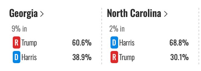 02:39 Пока Трамп продолжает лидировать в Джорджии (где у него уже более 60%), Харрис лидирует в еще одном колеблющемся штате - Северной Каролине (почти 69% по итогам подсчета 2% голосов).