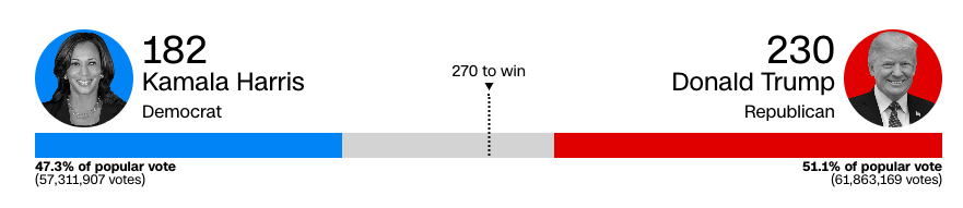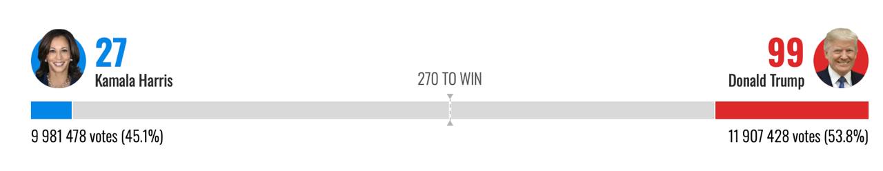 Общий счет сейчас - 90 выборщиков у Трампа и 27 у Камалы Харрис.