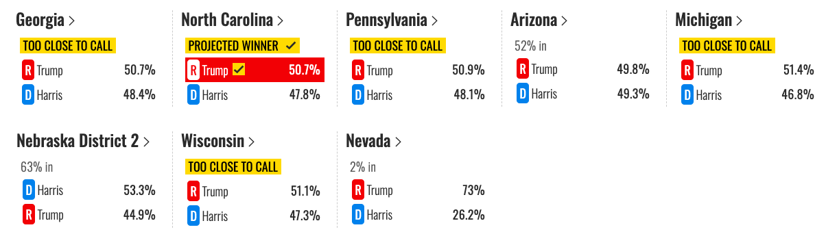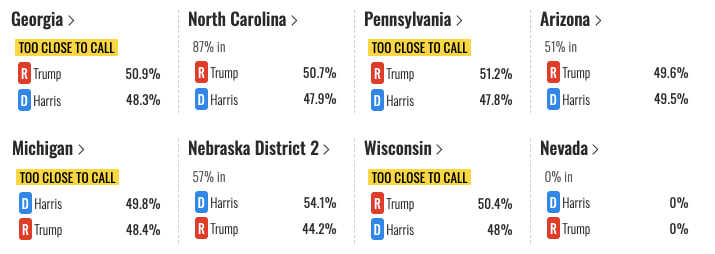 На эту минуту активно считают голоса в семи из восьми ключевых штатах.