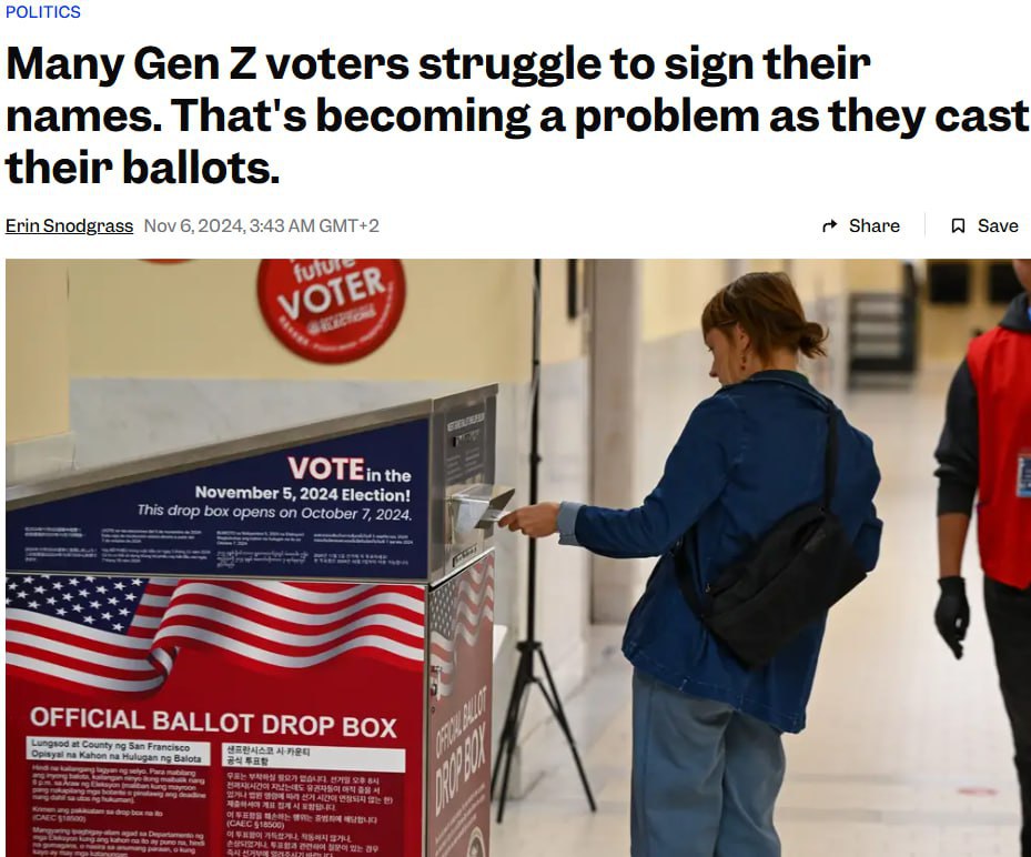 Издание сообщает, что из-за неспособности зумеров поставить две одинаковые подписи при голосовании по почте в ряде штатов были испорчены тысячи бюллетеней. Когда зумерам пытались позвонить для уточнения данных, оказалось, что молодёжь не отвечает на звонки с незнакомых номеров.