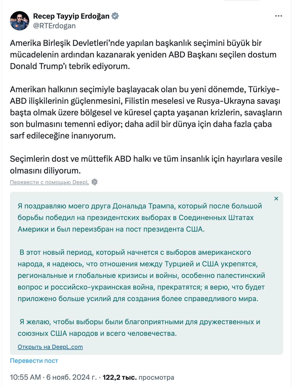 "Кто бы ни победил завтра в США, фокус будет на прекращении этой ужасной войны – надеюсь, на условиях, которые не будут поощрять агрессию", – написал он.