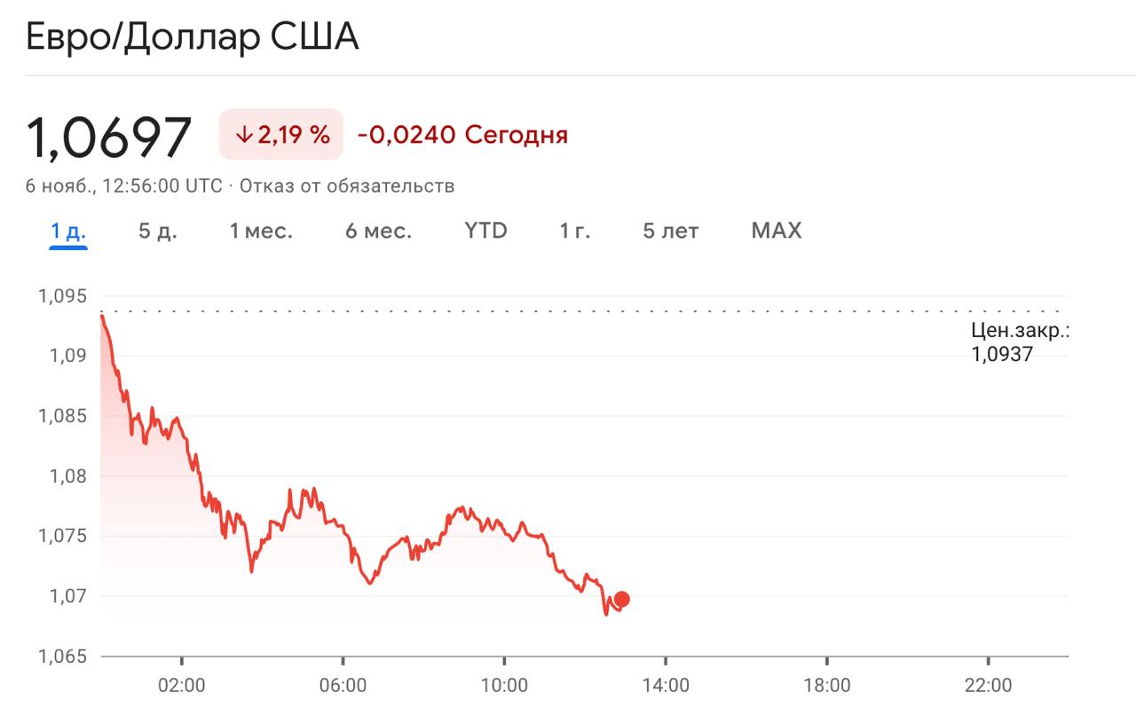 15.03 Евро падает к доллару на фоне новостей о победе Трампа - уже 1,0697.