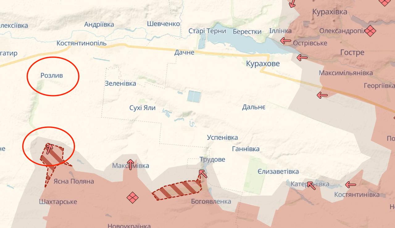 11.00 Армия РФ существенно продвинулась со стороны Ясной Поляны к селу Разлив, что возле трассы, ведущий с запада на Курахово, свидетельствует карта Deep State.