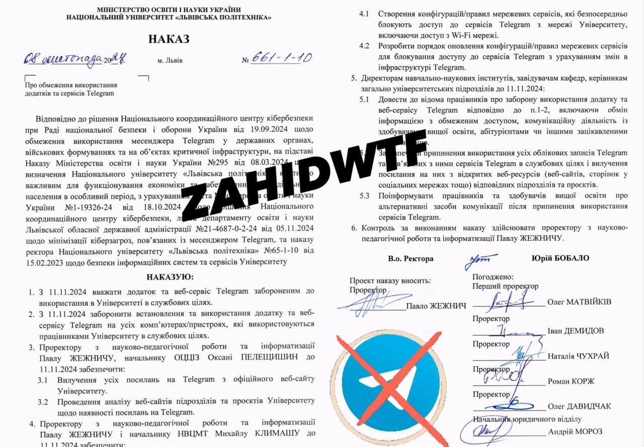 Между тем в украинских организациях и вузах Телеграм продолжают запрещать использовать в служебных целях. Недавно это сделали Национальный университет "Львовская политехника" и Киевский политехнический институт имени Игоря Сикорского, о чем свидетельствуют соответствующие приказы их ректоров, опубликованные в сети.