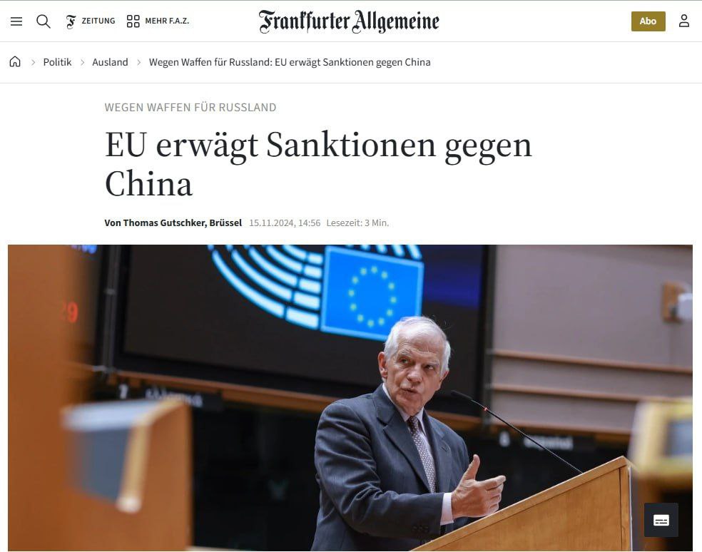 "Теперь нам следует рассмотреть весь набор инструментов, который есть в распоряжении ЕС, включая новые запреты на ведение бизнеса с китайскими компаниями, замораживание активов и запрет на въезд. Но также необходимо напрямую поговорить с Китаем и дать ему понять, что он всегда говорил, что хочет быть нейтральным, но не нейтрален", - сказал дипломат.