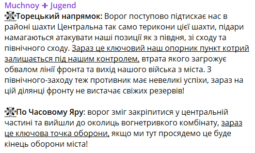 Военнослужащий с позывным "Мучной" пишет, что россияне смогли закрепиться в центральной части и вышли к окрестностям огнеупорного комбината.
