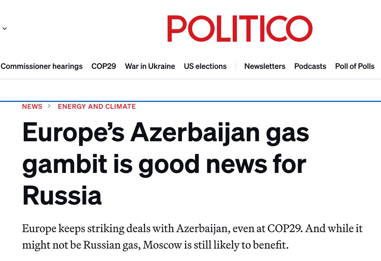 "Это креативное решение - лишь тонкая маска для неудобной правды: по сути, Азербайджан будет отмывать российский газ для Европы", - пишет Politico.