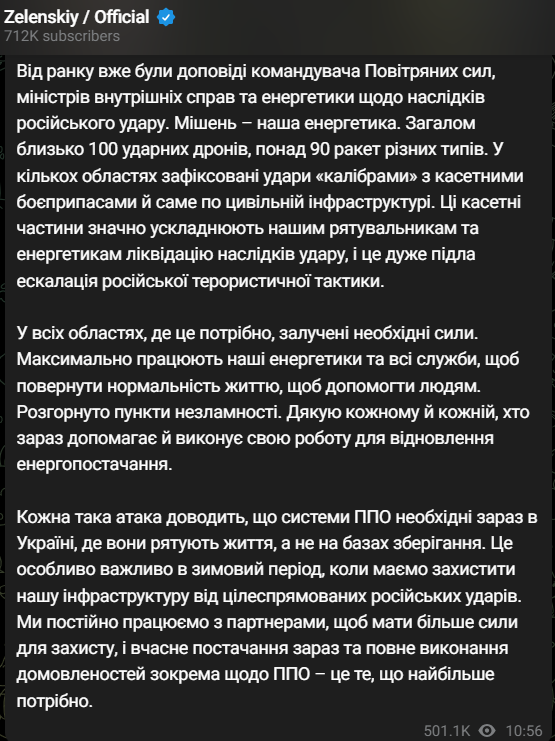 "Эти кассетные части значительно усложняют нашим спасателям и энергетикам ликвидацию последствий удара, и это очень подлая эскалация российской террористической тактики", - пишет президент.