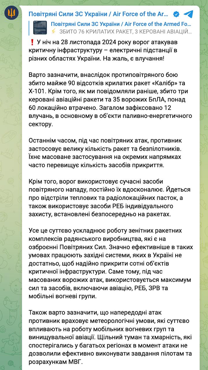 ВС заявляют, что сбили почти 90% крылатых ракет и перечисляют сложности своей работы: ракет и дронов часто на порядок больше, чем средств прикрытия, западного оружия не хватает, РФ совершенствует способы обстрелов и подбирает для атаки подходящую погоду: туман и облачность.