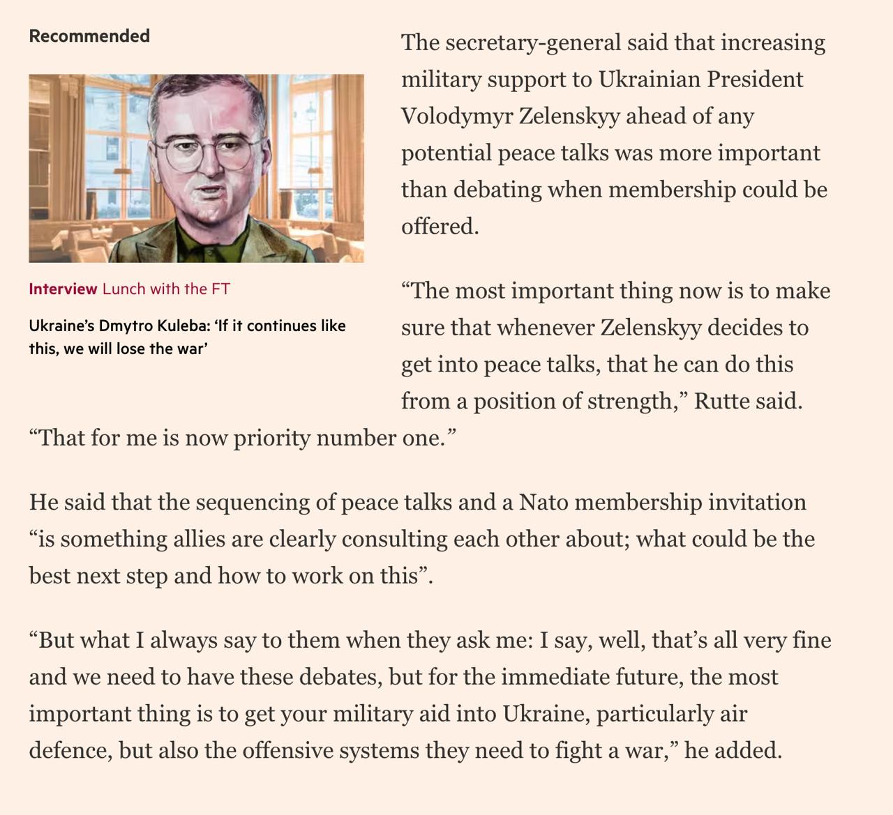 Тем временем генсек НАТО Марк Рютте заявил, что тема членства Украины сейчас второстепенная, передает Financial Times.