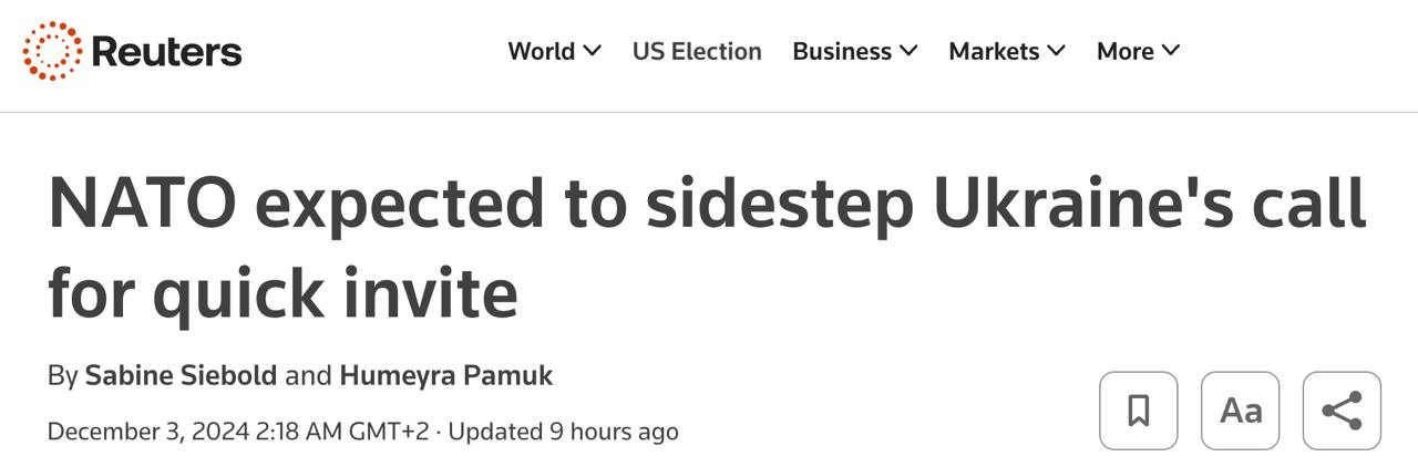 А Reuters со ссылкой на источники пишет, что НАТО "вряд ли прислушается к призыву Украины о приглашении вступить в Альянс" на сегодняшней встрече министров иностранных дел. По данным издания, "нет никаких признаков необходимого консенсуса" среди 32 членов НАТО, что "разбивает надежды Киева на политический подъем".