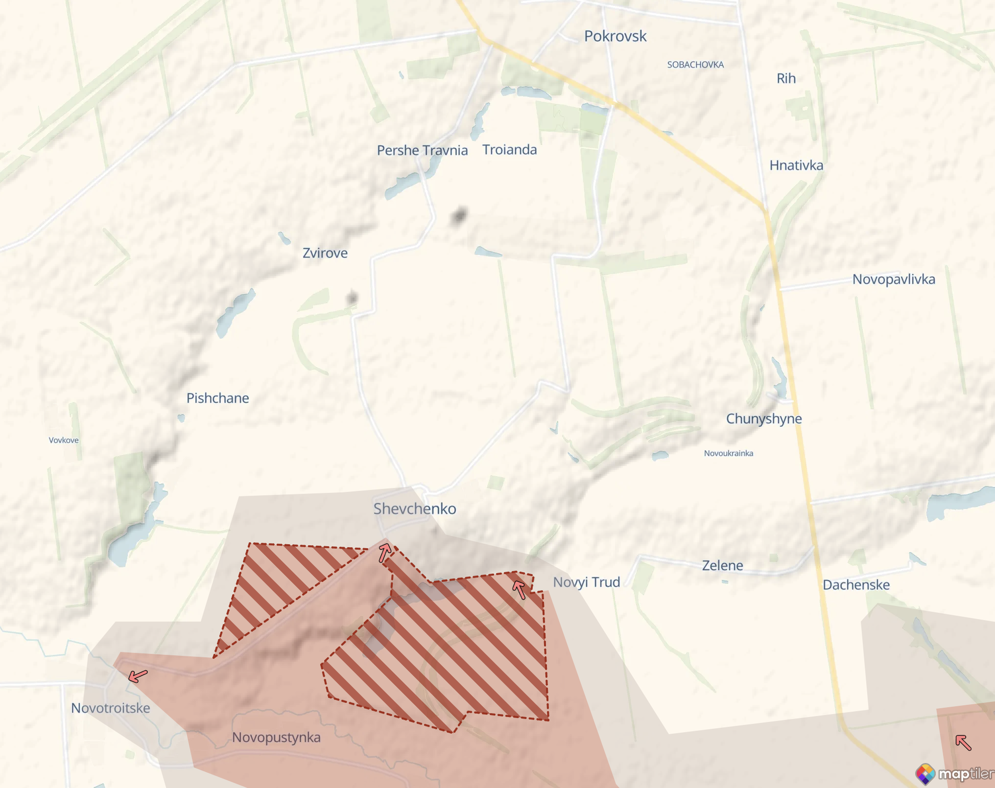 От Шевченко началось наступление северо-западнее - в сторону села Песчаное, до которого осталось меньше километра. Это направление с явной попыткой охвата Покровска с тыла.