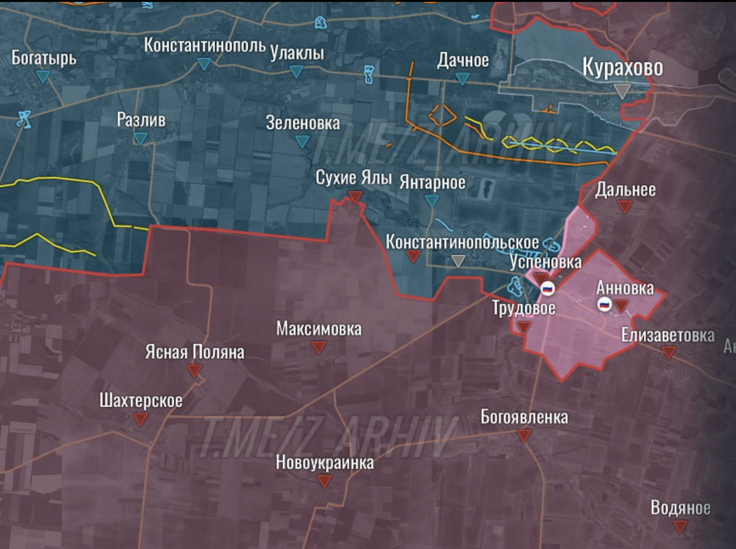 По его сведениям, россияне также пытаются выйти на рубеж между Успеновкой и Анновкой, там идут бои. "Трудно понять смысл удержания "Успеновского мешка", когда враг продолжает постепенно захватывать Курахово", - резюмирует паблик.