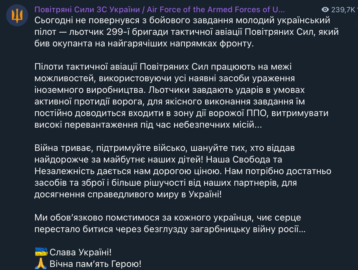 17:55 Украина заявила о гибели пилота ВСУ на фронте. Его самолет сбили сегодня.