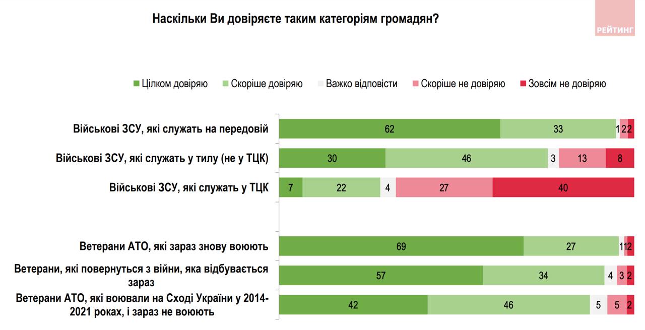 Военным на передовой доверяют 95% опрошенных. Военным в тылу (но не в ТЦК) - 76%.