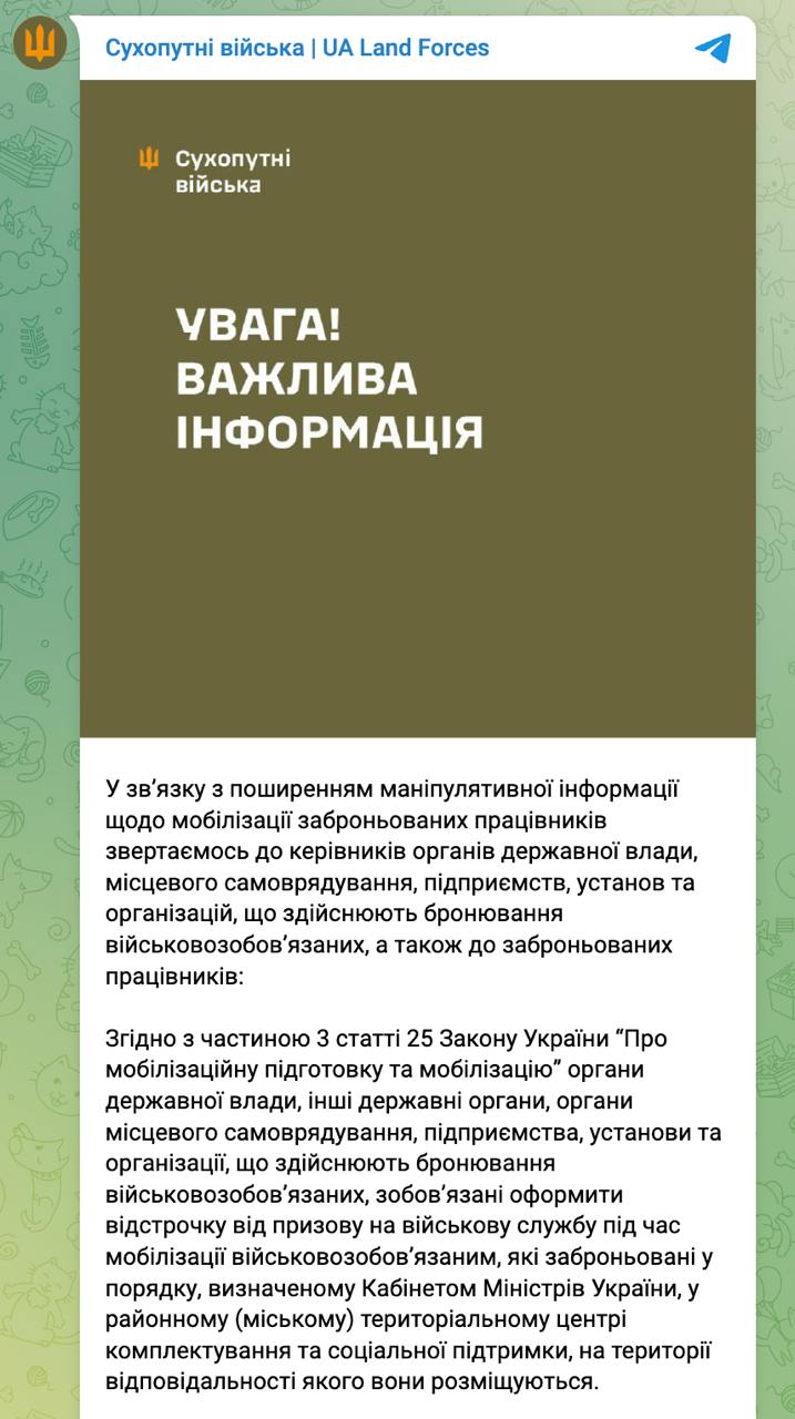 Сухопутные войска сообщают, что бронирования, оформленные не в "Дие", не появляются в реестре автоматически. А потому нужно самостоятельно подать в ТЦК сообщение о бронировании.