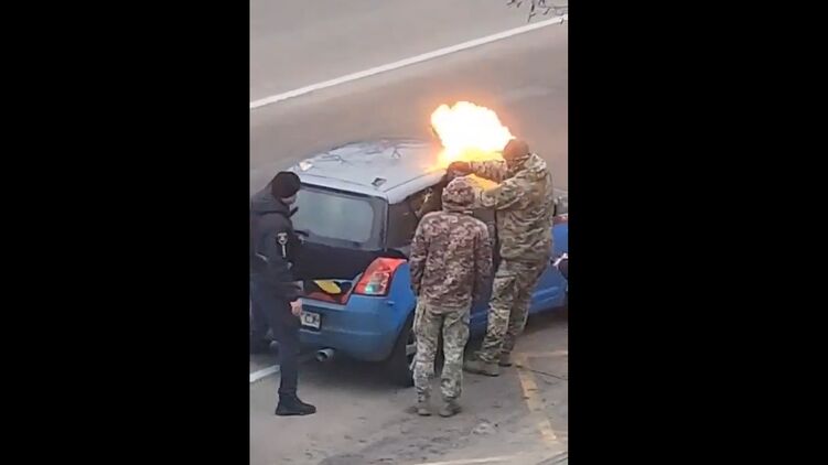 На кадрах видно, как военком в балаклаве поддевает элемент обшивки автомобиля и что-то просовывает в салон. После при помощи зажигалки мужчина в камуфляжной форме воспламеняет распылённое вещество, и огонь некоторое время горит над передней пассажирской дверью.