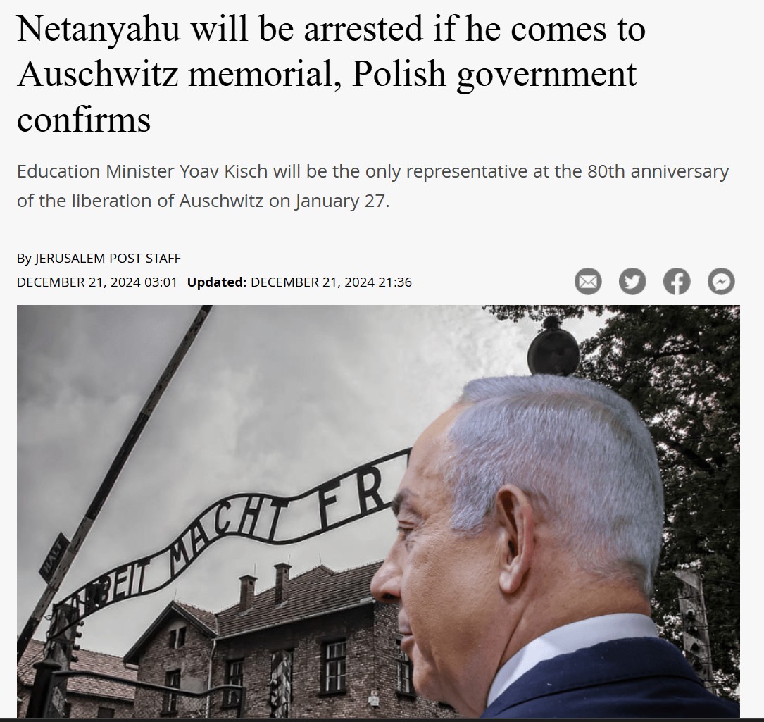 Польские источники сообщили Rzeczpospolita, что Варшава заявляет о готовности исполнить ордер МУС в отношении Нетаньяху в связи с тем, что надеется на арест Владимира Путина, в отношении которого МУС также выписал ордер на арест ещё в 2023 году.