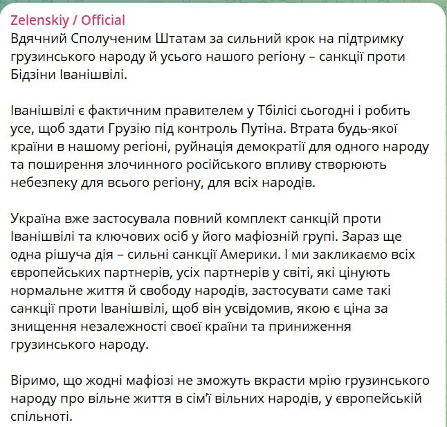 Президент Украины Владимир Зеленский поблагодарил Соединенные Штаты за санкции против основателя партии "Грузинская мечта" Бидзины Иванишвили и назвал его "мафиози".