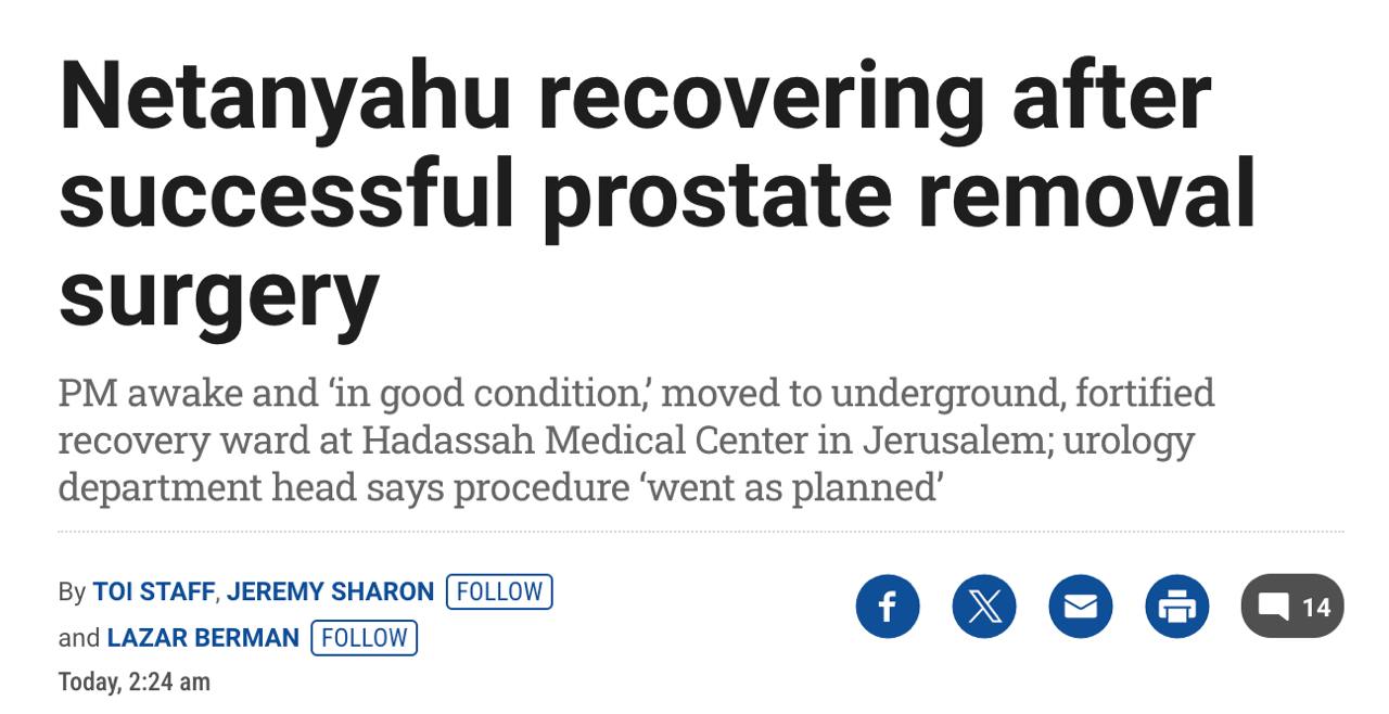 Премьер-министр Израиля Биньямин Нетаньяху перенес операцию по удалению простаты. Все прошло успешно и в данный момент политик восстанавливается.