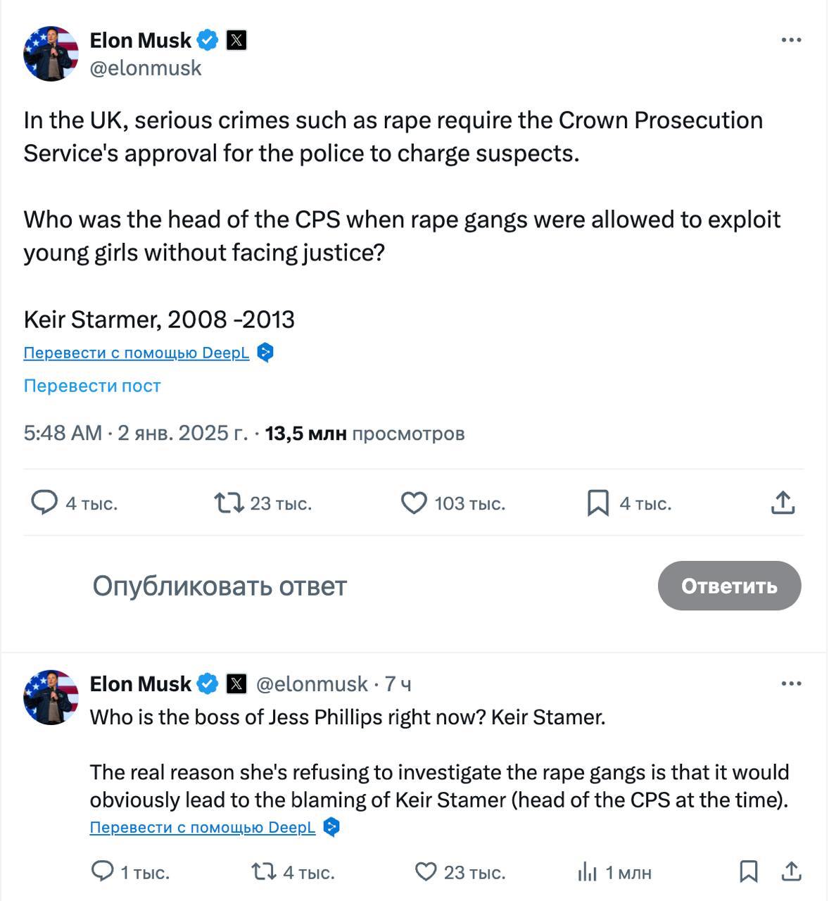 Американский миллиардер и бизнесмен Илон Маск раскритиковал в Сети премьер-министра Великобритании Кира Стармера, а также призвал к проведению новых выборов.