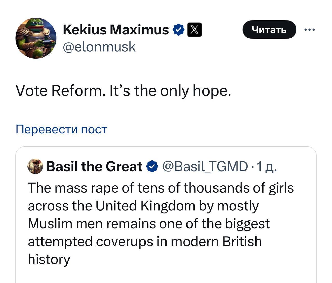 "Единственной надеждой" миллиардер считает правую партию Найджела Фаража Reform UK. По его словам, только она может "спасти" Великобританию.