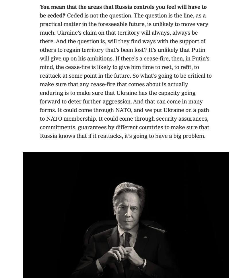 «Мы позаботились о том, чтобы задолго до начала российской агрессии, начиная с сентября, а затем снова в декабре, мы тайно доставляли много оружия в Украину, чтобы убедиться, что у них есть то, что им нужно для защиты - такие вещи, как «Стингеры», «Джавелины», которые сыграли важную роль в предотвращении захвата Россией Киева», - сказал госсекретарь в интервью New York Times.