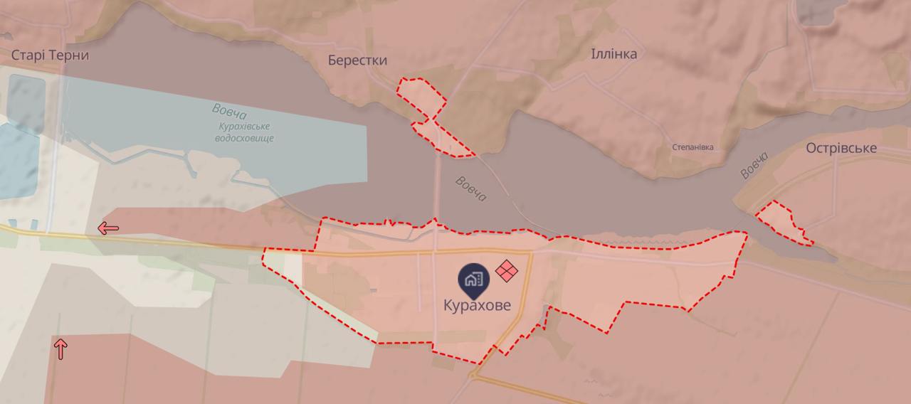 Карта Deep State показывает, что Курахово почти полностью под контролем РФ, и лишь небольшие участки находятся в серой зоне.
