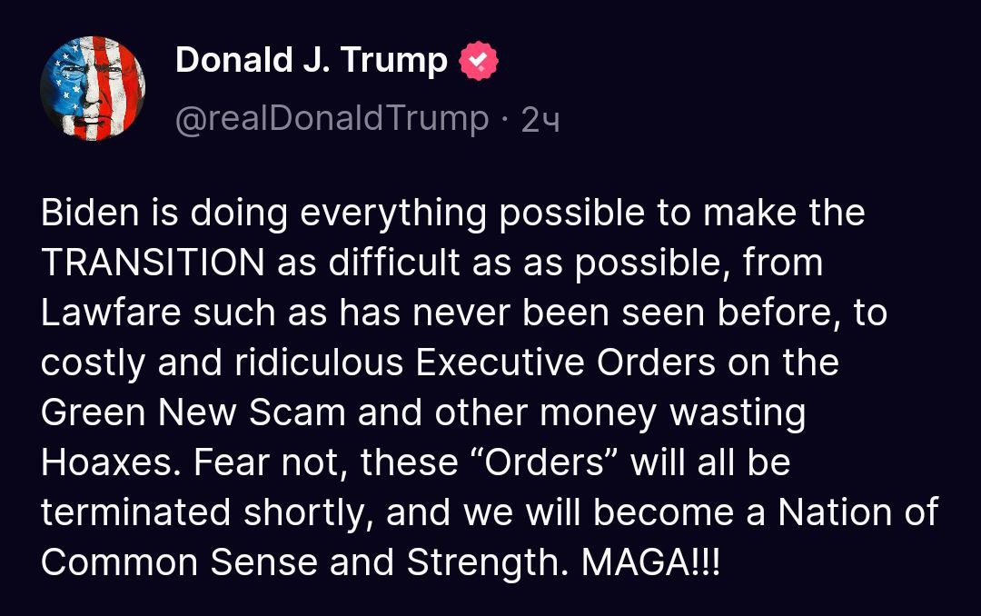 "Законодательство, какого ещё никогда не было, дорогостоящие и нелепые указы о новом "зелёном" мошенничестве и другие дорогостоящие пустые мистификации. Не бойтесь, все эти "приказы" скоро будут отменены, и мы станем Нацией Здравого смысла и силы", – пишет Трамп, завершая публикацию аббревиатурой своего политического лозунга: "Сделаем Америку снова великой!"