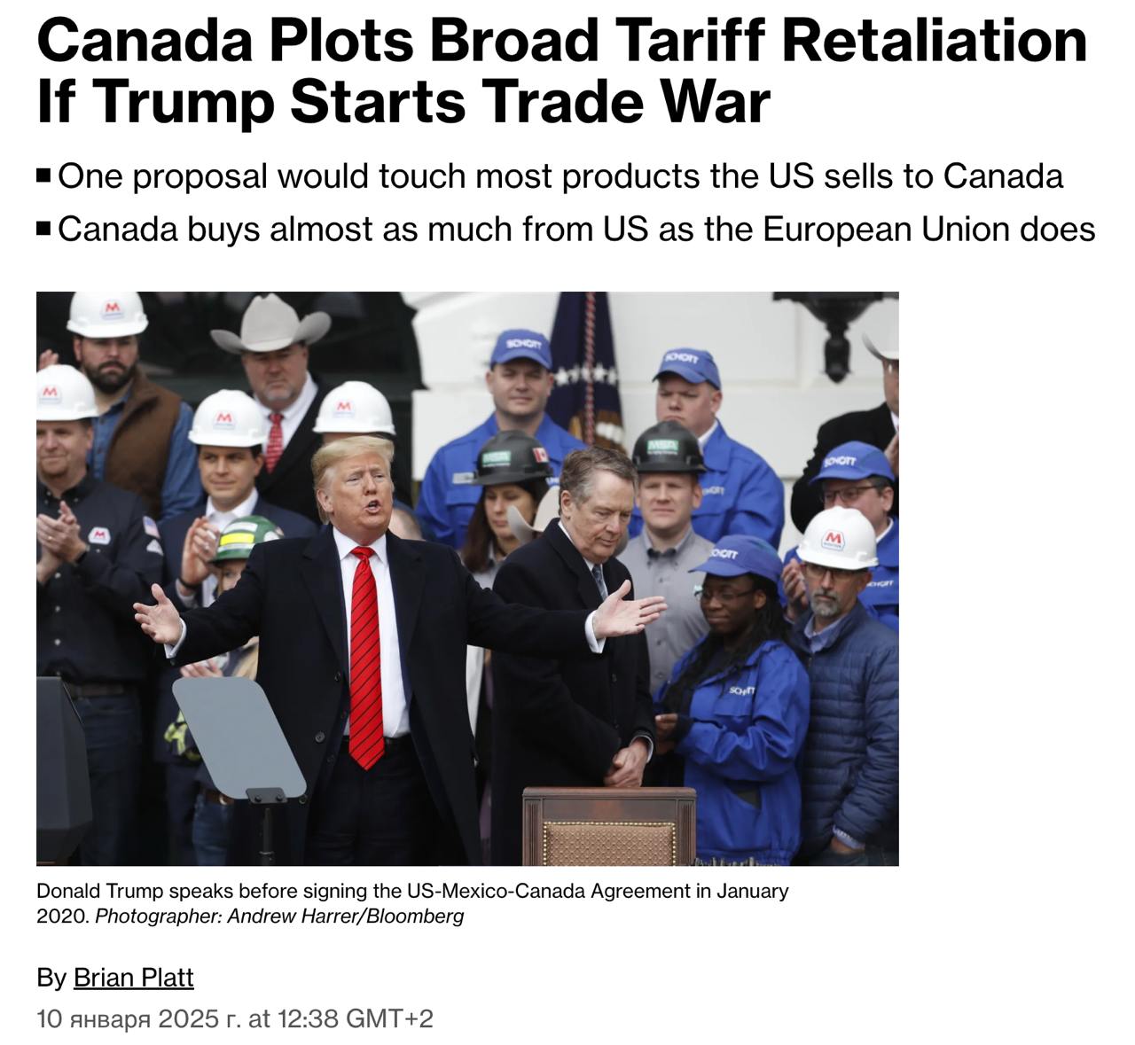 Правительство уходящего премьера Джастина Трюдо изучает варианты ответных действий, но надеется, что Трамп не станет вводить 25%-ые пошлины на все канадские товары, как обещал.