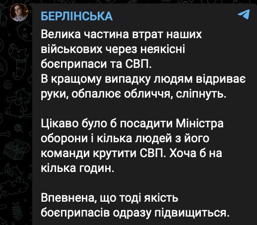 "Интересно было бы посадить Министра обороны и несколько человек из его команды крутить СВП. Хотя бы на несколько часов. Уверена, что тогда качество боеприпасов сразу вырастет", - заявила волонтер.