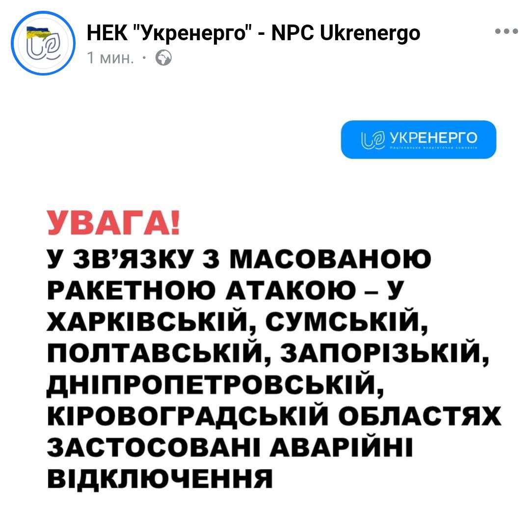 8.00 Аварийные отключения света идут в Харьковской, Сумской, Полтавской, Запорожской, Днепропетровской и Кировоградской областях.