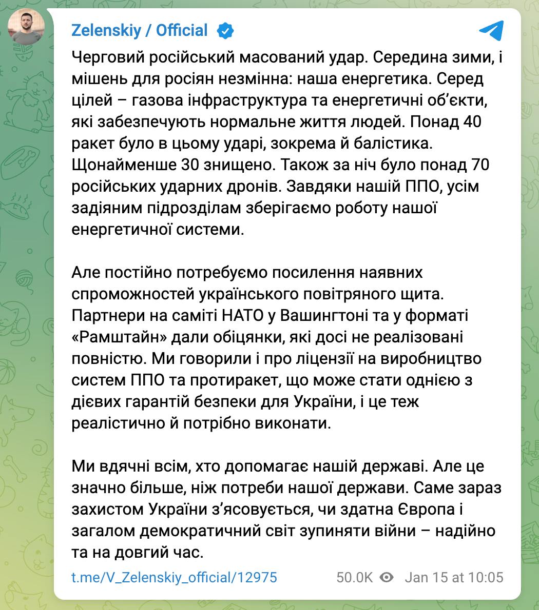 Напомним, с 1 января Украина прекратила транзит российского газа в ЕС. По мнению украинских властей, сегодняшний удар РФ был направлен на ГТС.