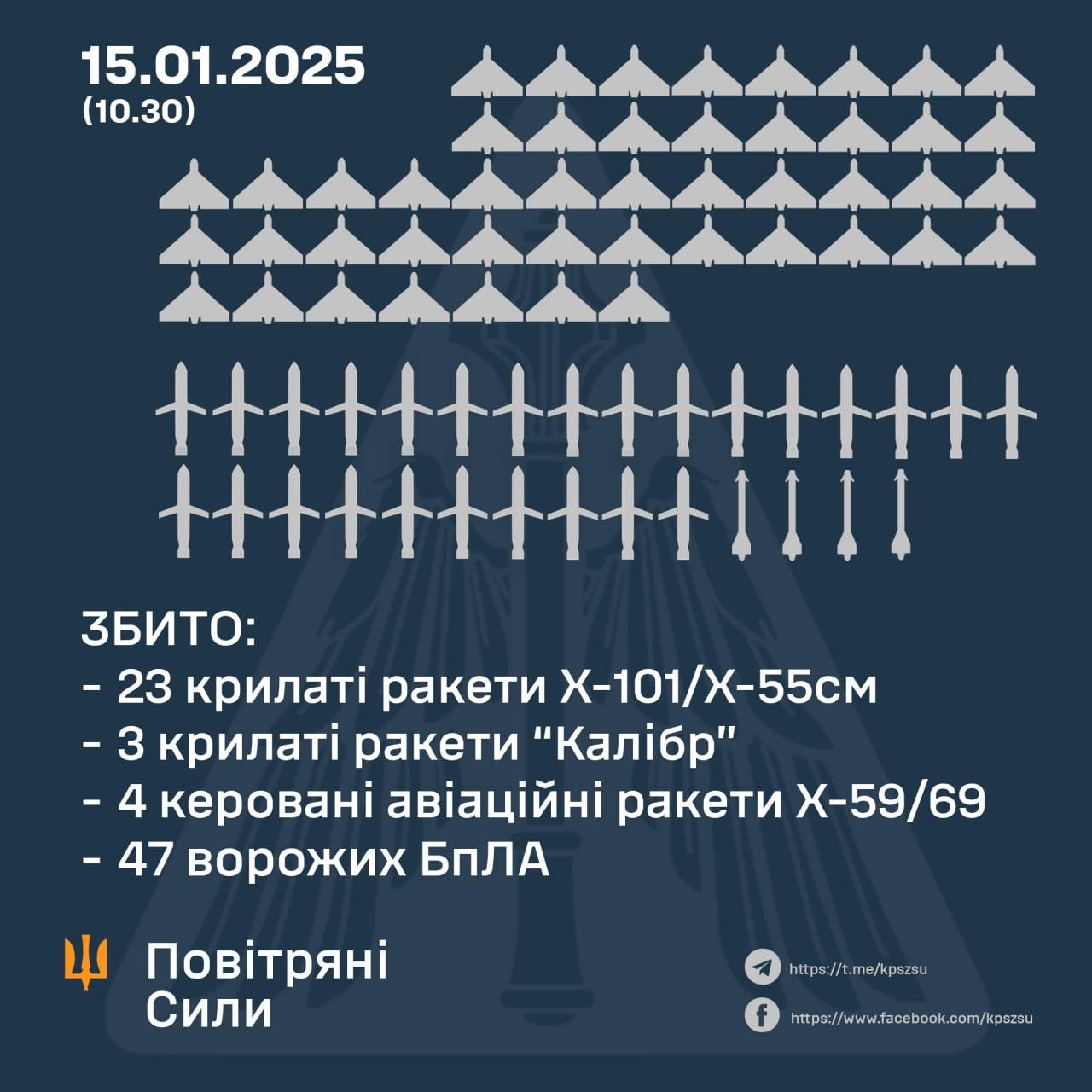 "Далеко не все ракеты, не попавшие в статистику сбитых, достигли целей. Противник атаковал объекты украинской энергетики, в частности, газовую инфраструктуру на Харьковщине, Львовщине и Ивано-Франковской области. К сожалению, в результате российской атаки есть поражение объектов", - сообщают ВС.
