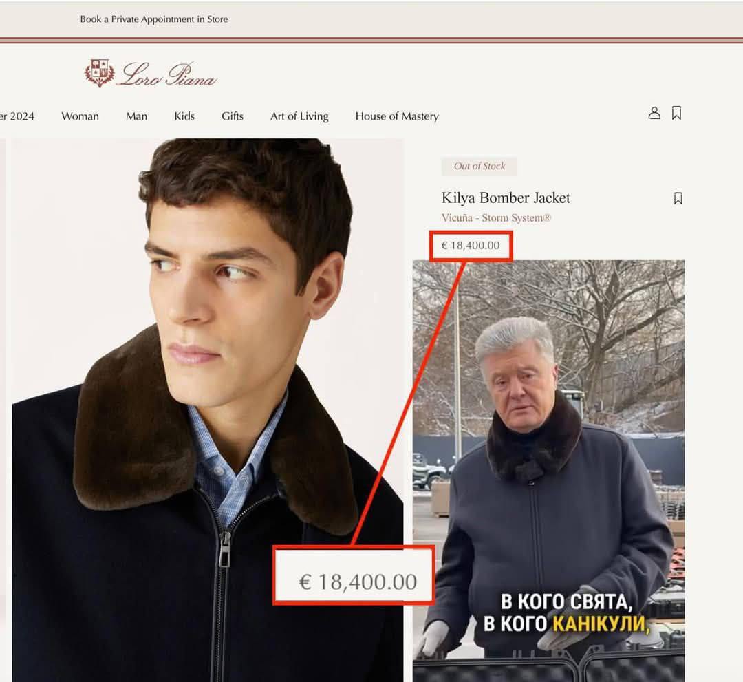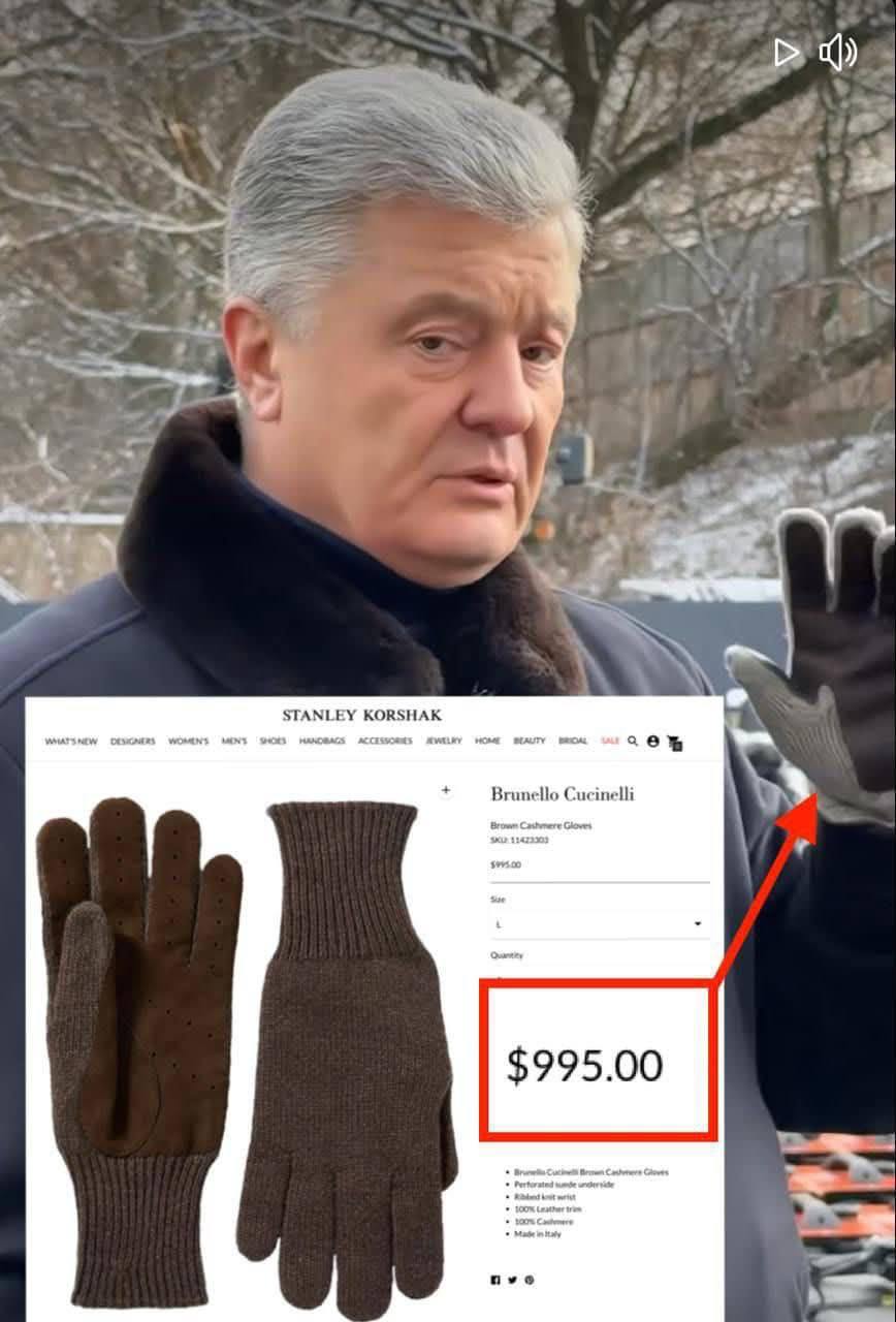 По его словам, в ролике на Порошенко надеты куртка от Loro Piana за 18,4 тысяч евро (это примерно 800 тысяч гривен) с воротником из крашеного сицилийского барса, а также перчатки бренда Brunello Cucine за 1 тысячу евро (более 40 тысяч гривен).