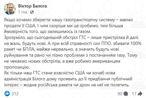 "Если хотим сохранить нашу газотранспортную систему – должны продать ее США. И чем скорее мы это сделаем, тем больше вероятность того, что останемся с газом. Понятно, что сегодняшний обстрел ГТС – только пристрелка и дальше, к сожалению, будут новые. А при всей исправности сил ПВО сбивать 100% ракет или БПЛА почти нереально, а значит, будут новые разрушения и рано или поздно проблемы с поставкой газа. Поэтому не ждем новых обстрелов, а уже делаем американцам предложение. Как только наша ГТС станет собственностью США или хотя бы новая администрация Белого дома проявит к ее приобретению публичный интерес – ни одна российская ракета или дрон на нее не полетит", – написал он.