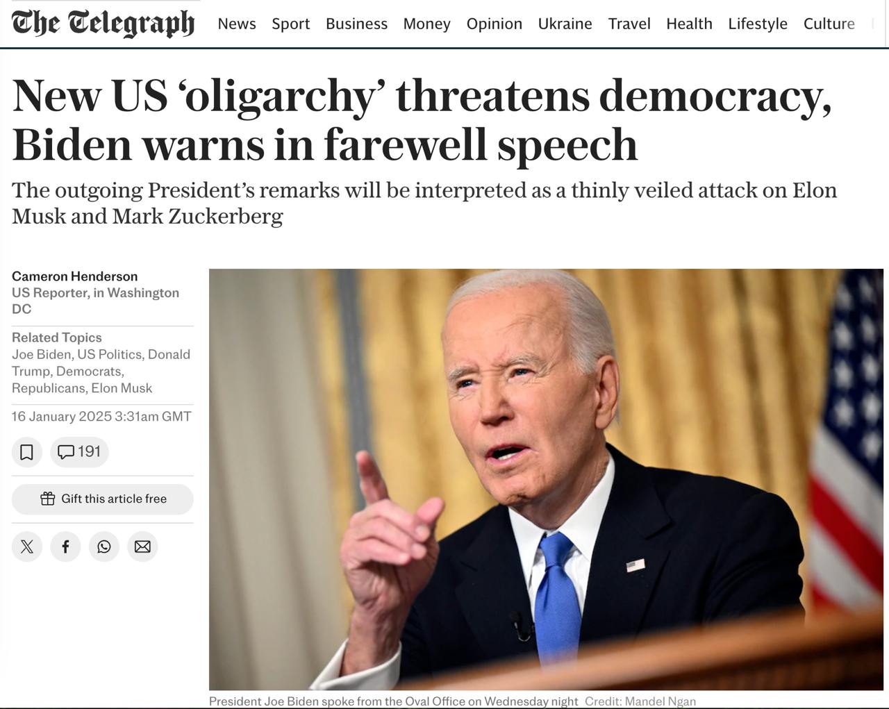 Уходящий с поста президента США Джо Байден в своей прощальной речи заявил, что новая технологическая "олигархия" США угрожает всей демократии, имея в виду Илона Маска и Марка Цукерберга и других сверхбогатых людей из технологической сферы.