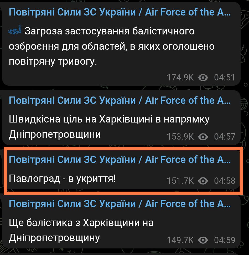При этом, Воздушные силы сообщали о полете баллистических ракет на Павлоград.