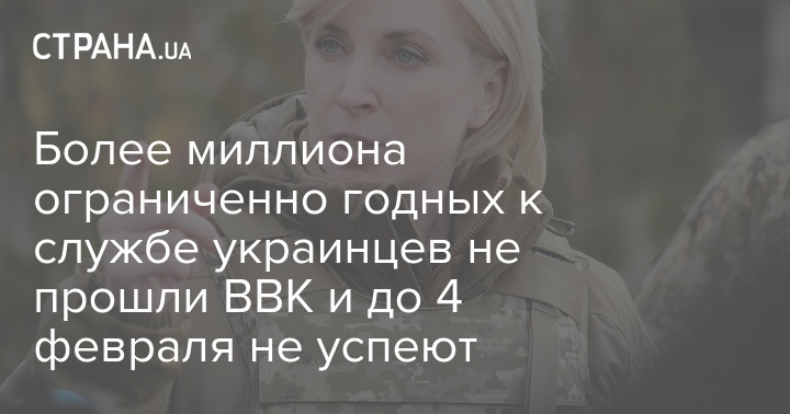 "На сегодняшний день большинство из них (более 1 миллиона человек!) ещё не прошли соответствующие медосмотры. В том числе потому, что не получали вызовов на ВЛК или не могут их получить в ТЦК (потому что там очереди). Очевидно, что совершенно нереально пропустить через ВВК такое количество людей до 4 февраля", – написала чиновник.