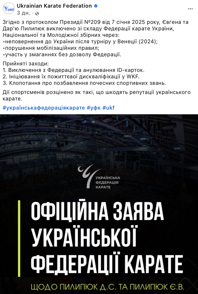 Украинская федерация карате лишила их членства в организации за "невозвращение в Украину и нарушение правил мобилизации". Также в УФК заверили, что будут добиваться от Всемирной федерации карате пожизненной дисквалификации спортсменов и лишения спортивных наград.