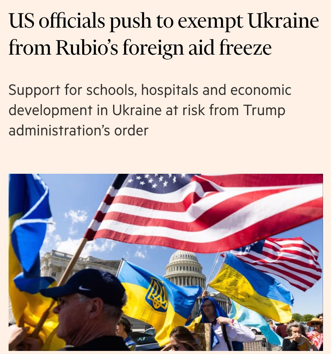 При этом, по данным FT, американские дипломаты в Европе уже написали в Госдепартамент запрос по возобновлению финансирования Украины, чтобы его исключили из 90-дневной заморозки.