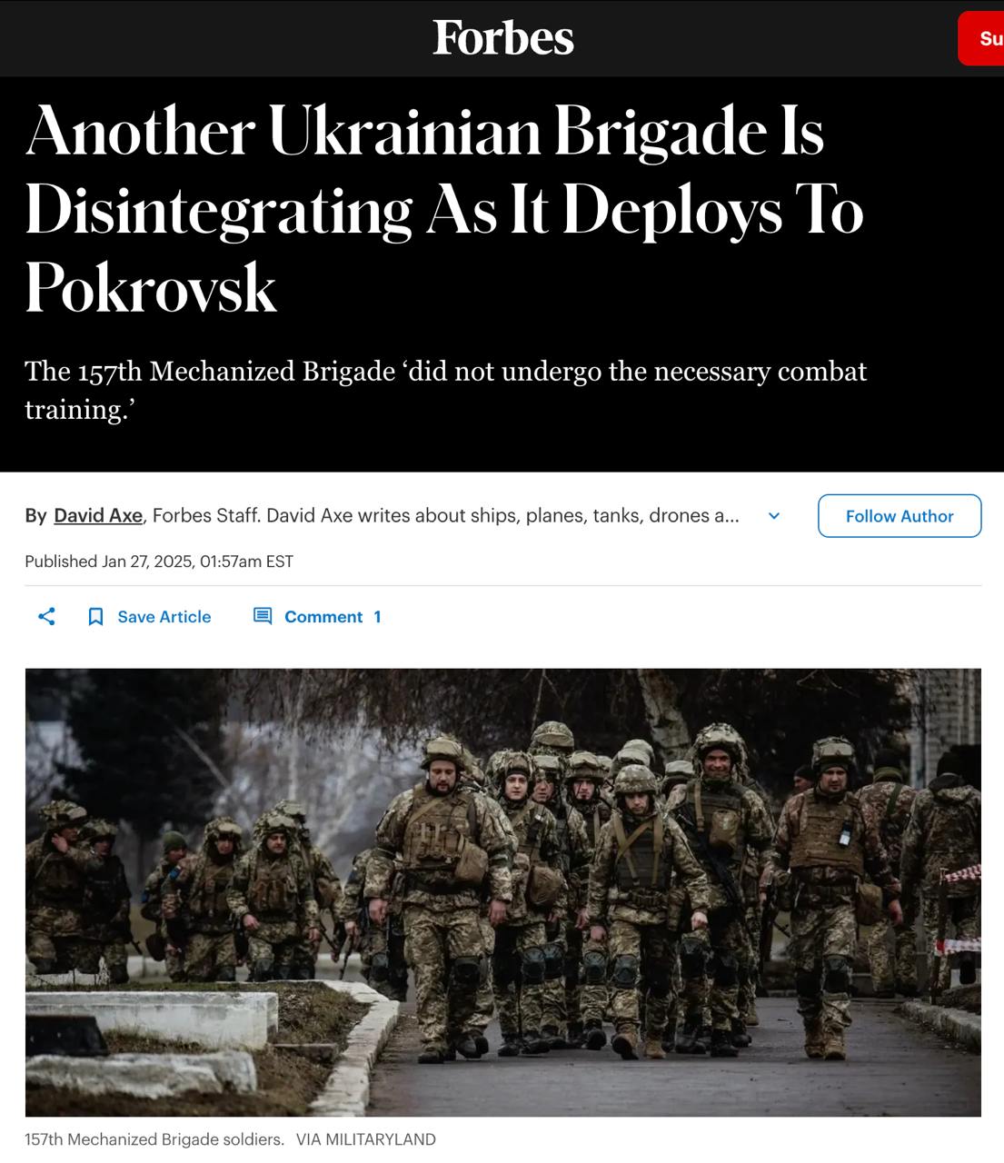 Вторая за месяц бригада ВСУ "распадается по мере развертывания на передовой". Речь идет о 157-й отдельной механизированной бригаде, которую отправляют под Покровск.