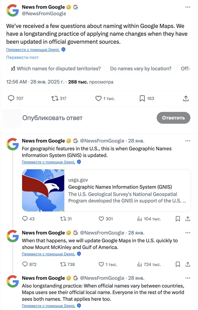 "Если официальные названия в разных странах отличаются, пользователи Google Maps будут видеть официальное местное название. Для всех остальных пользователей по всему миру будут отображаться оба варианта", — заявила компания в посте в социальной сети.