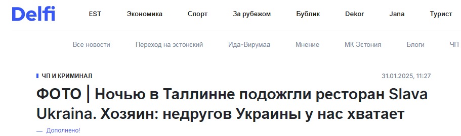 В ночь на пятницу в эстонской столице Таллинне подожгли ресторан Slava Ukraina.