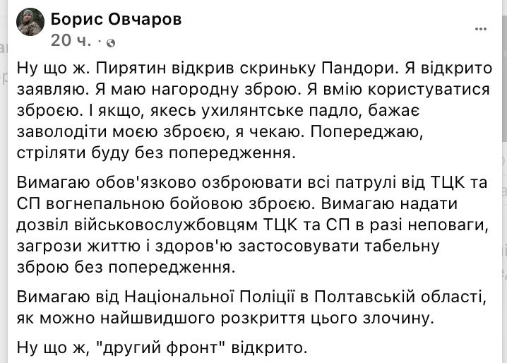 "Пирятин открыл ящик Пандоры. Я открыто заявляю. У меня есть наградное оружие. Я умею пользоваться оружием. И если какая-то уклонистская падаль желает завладеть моим оружием, я жду. Предупреждаю, буду стрелять без предупреждения", - написал он.