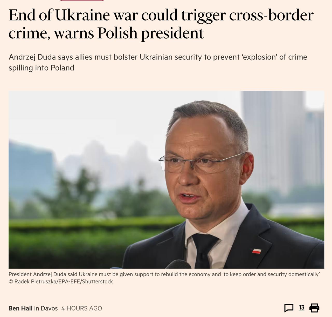 Президент Польши Анджей Дуда заявил, что завершение войны в Украине и возвращение с фронта тысяч мужчин могут привести к взрывному росту международной организованной преступности. При этом, по его мнению, у многих военных будут проблемы с психикой.