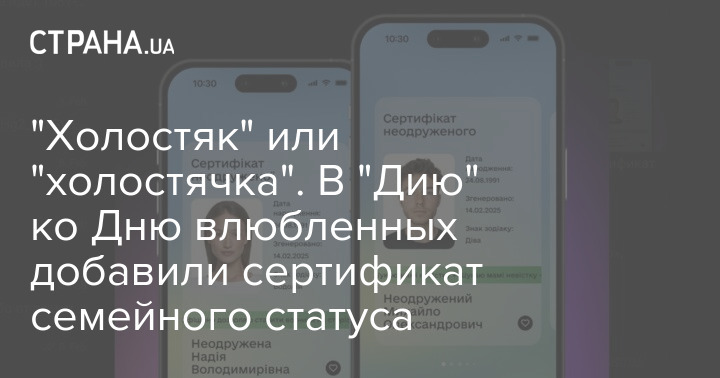 В приложение "Дия" добавили сертификат семейного статуса, в том числе холостяка и холостячки. Функция была введена ко Дню влюбленных.