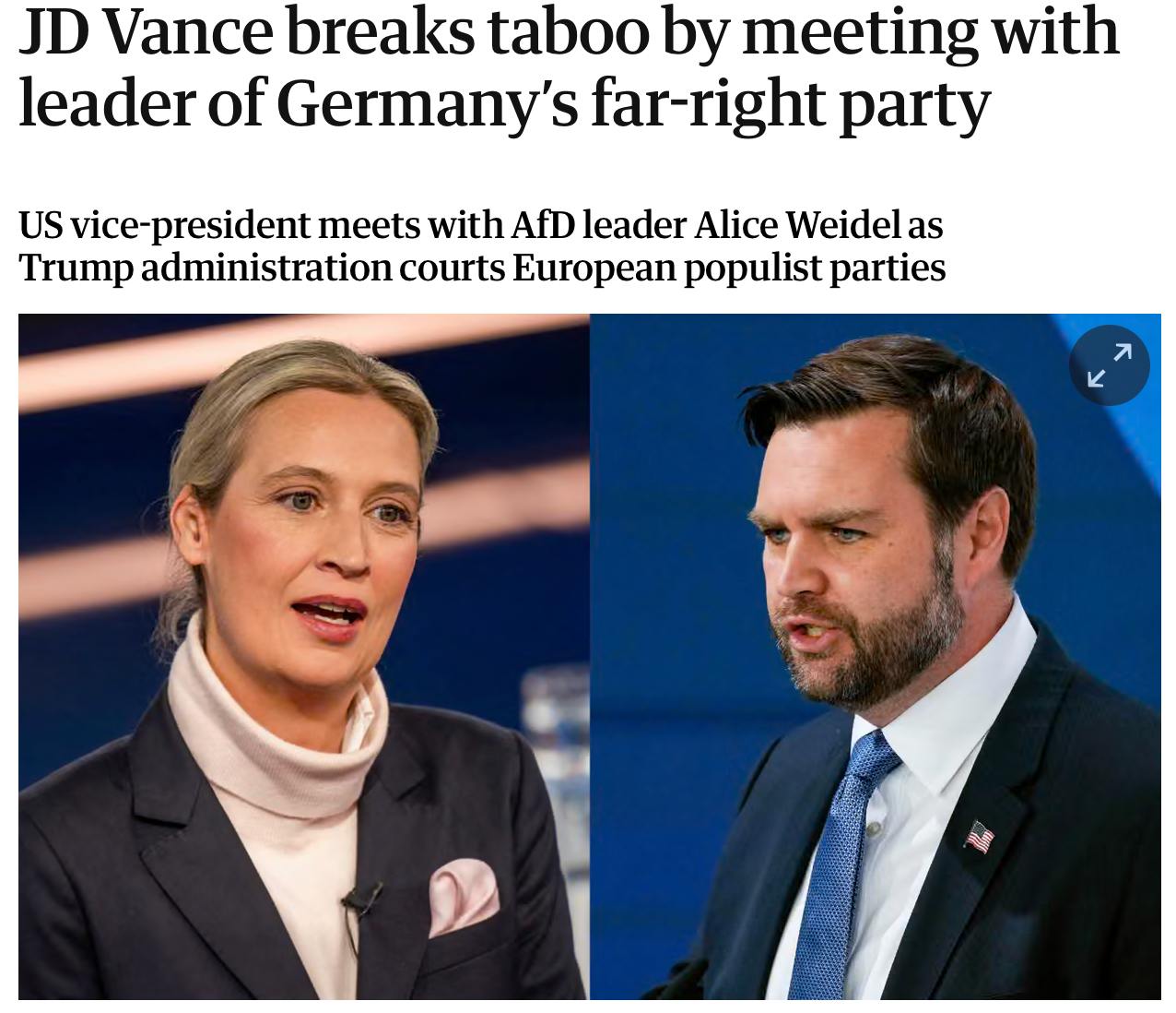 Вице-президент США Джей Ди Вэнс встретился с лидером ультраправой партии "Альтернатива для Германии"(АдГ) Алисой Вайдель.
