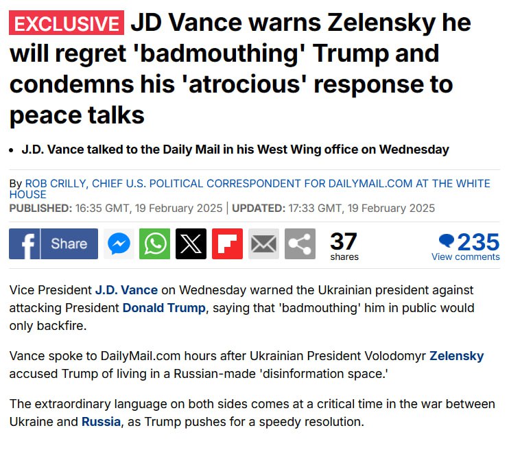 Вице-президент США Джей Ди Вэнс предупреждает Владимира Зеленского, что он пожалеет о том, что "облил грязью" главу Белого дома Дональда Трампа, и осуждает "ужасную" реакцию президента Украины на мирные переговоры.
