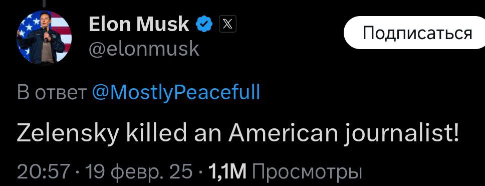 "Зеленский убил американского журналиста", - утверждает Маск в ответ на пост об этой истории.